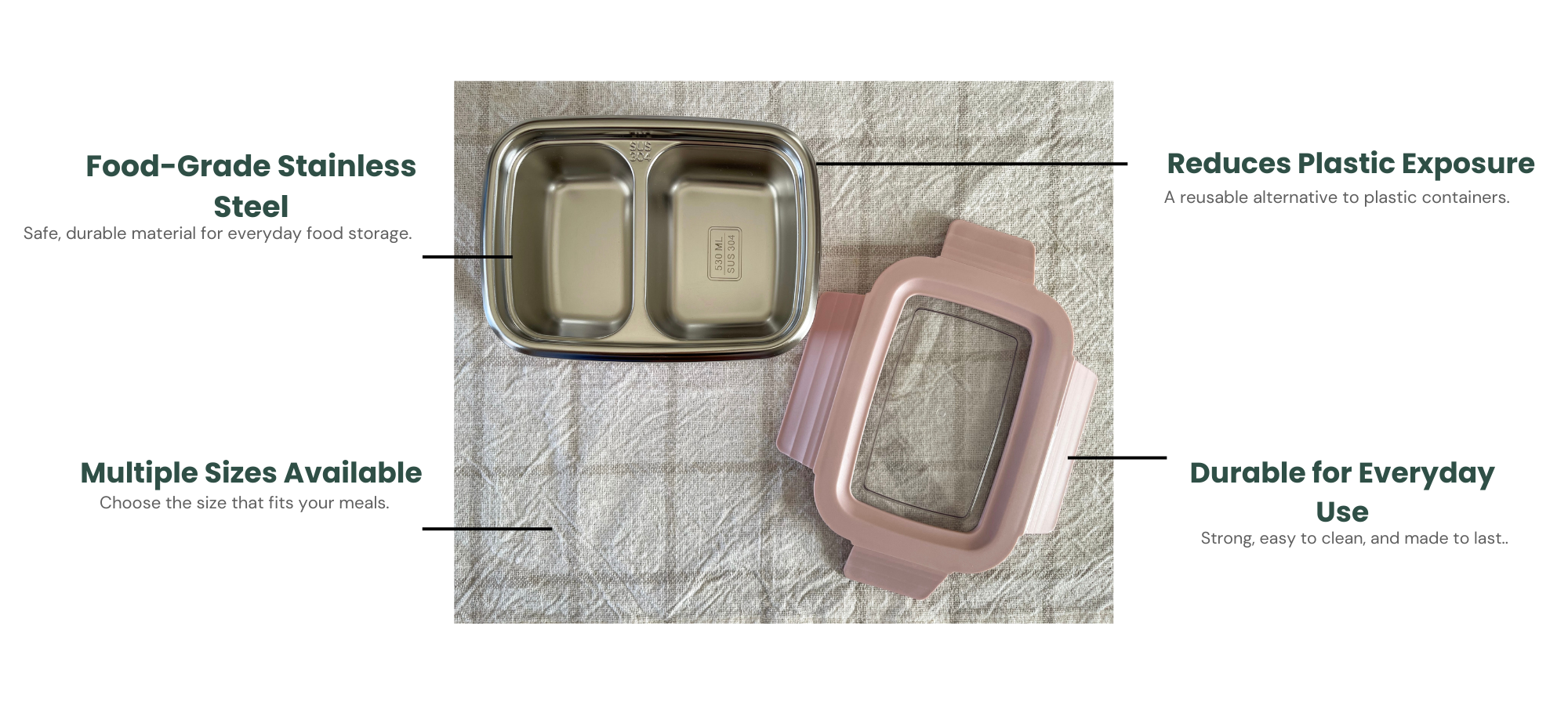 Stainless steel compartments help keep your food out of plastic containers during everyday meals.